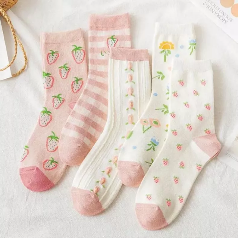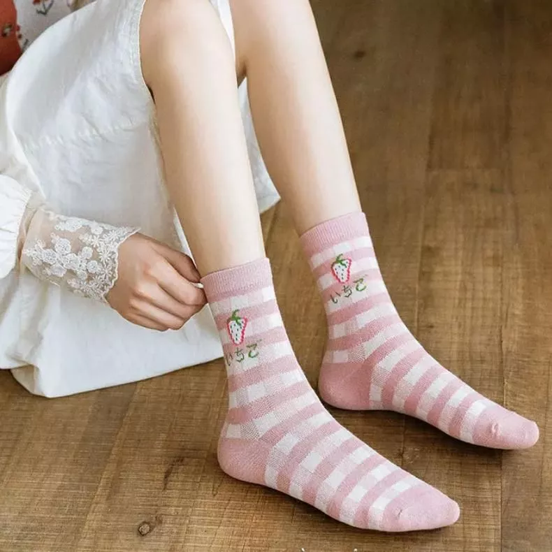 Charming Harajuku Kawaii Cotton Socks with Strawberry & Floral Patterns