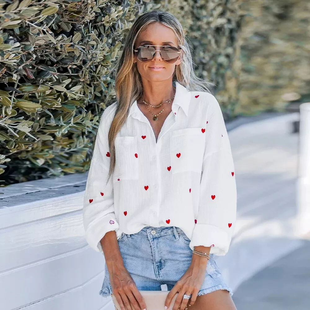 Step into the season with style and comfort with our Cotton Embroidered Heart Long Sleeve Blouse. Designed for the woman who cherishes both comfort and chic, this casual loose-fit top blends classic elegance with a playful twist. Its heart embroidery adds a unique touch to your everyday look, making it perfect for a variety of occasions – from work to weekend outings.