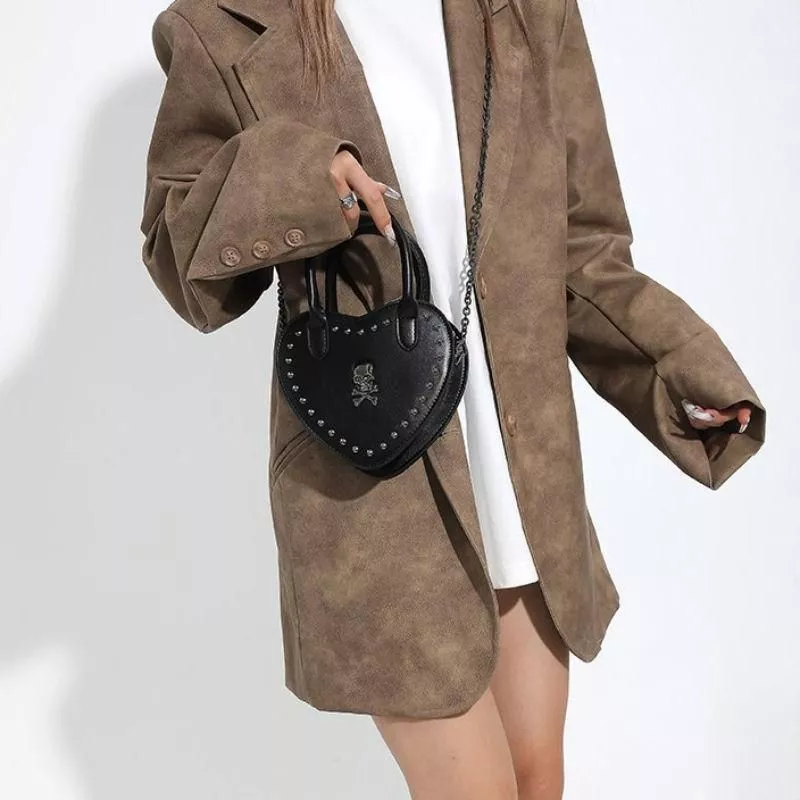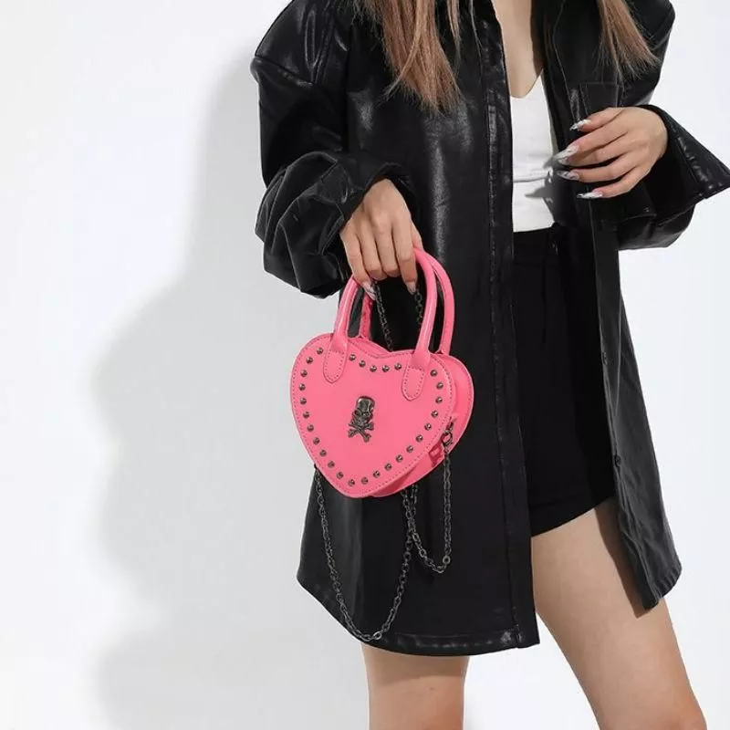 Step into a world where fashion meets rebellion with our Heart-Shaped Y2K Punk Skull Crossbody Bag. Crafted for those who dare to stand out, this bag blends the essence of gothic charm with hip-hop vibes, making it a perfect accessory for any statement-maker. With its unique heart shape, exquisite skull applique, and bold rivet detailing, this bag is not just an accessory but a declaration of style.