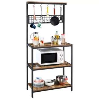 67″ Rustic Brown Wooden Kitchen Bakers Rack with Storage Shelves & Hooks