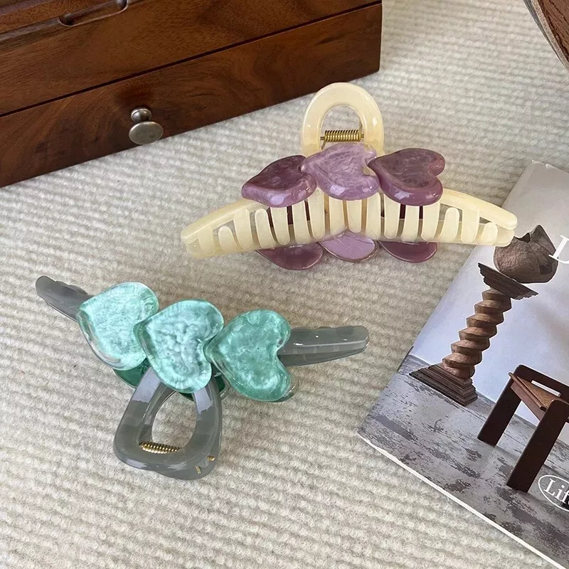 Featuring a captivating love heart design adorned with sparkling ice crystals, this large hair claw exudes charm and sophistication. Its candy colors add a playful yet chic element to any hairstyle, while the sturdy construction ensures long-lasting durability.