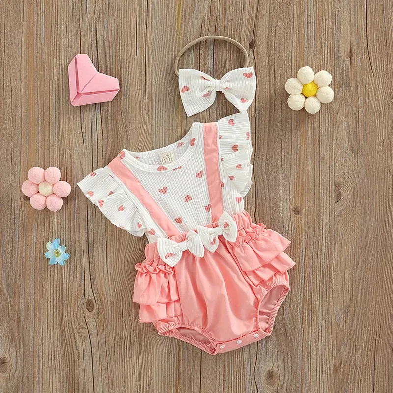 Pink Heart Pattern Baby Girl Romper & Bow Knot Headdress Set (0-18M)